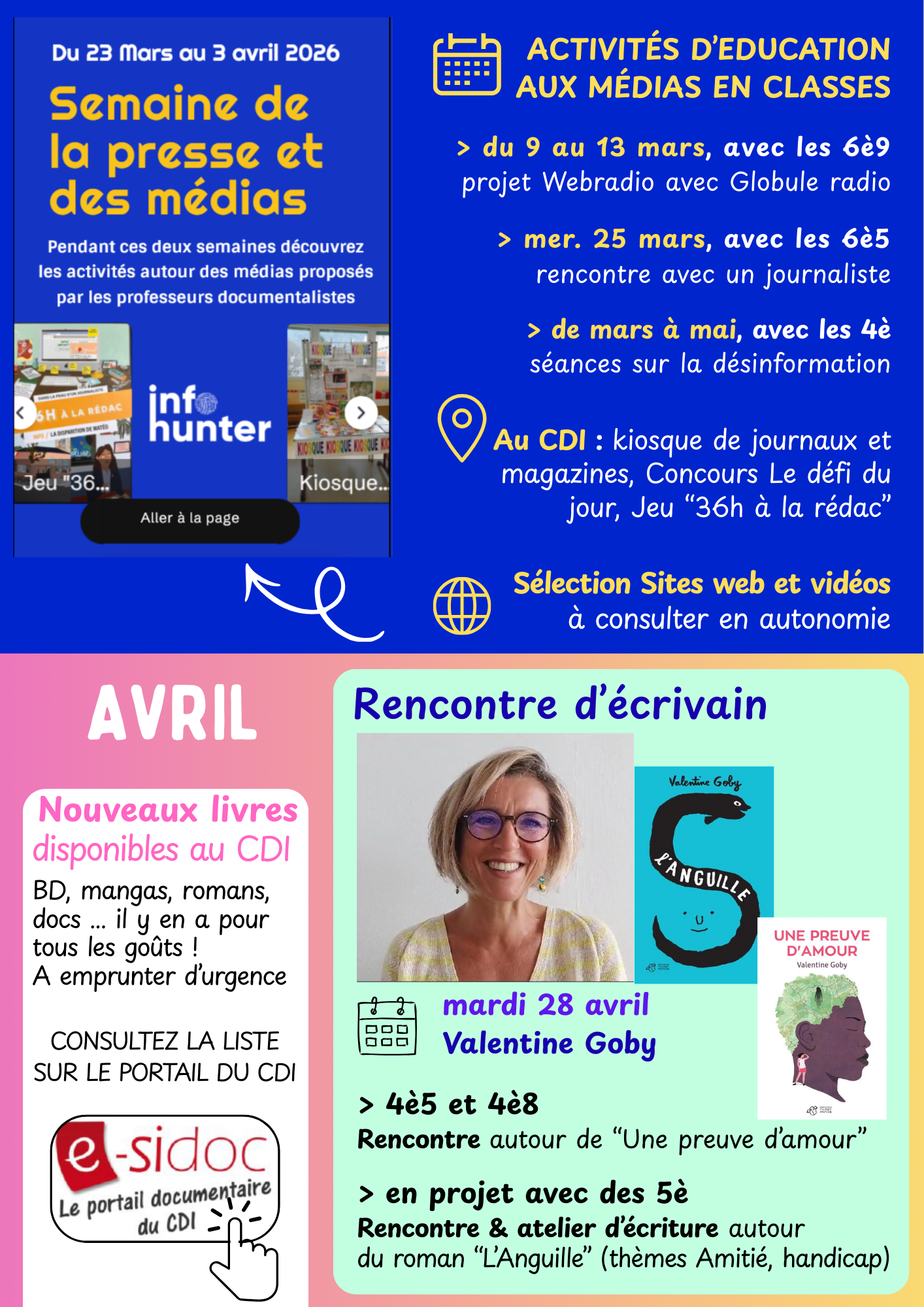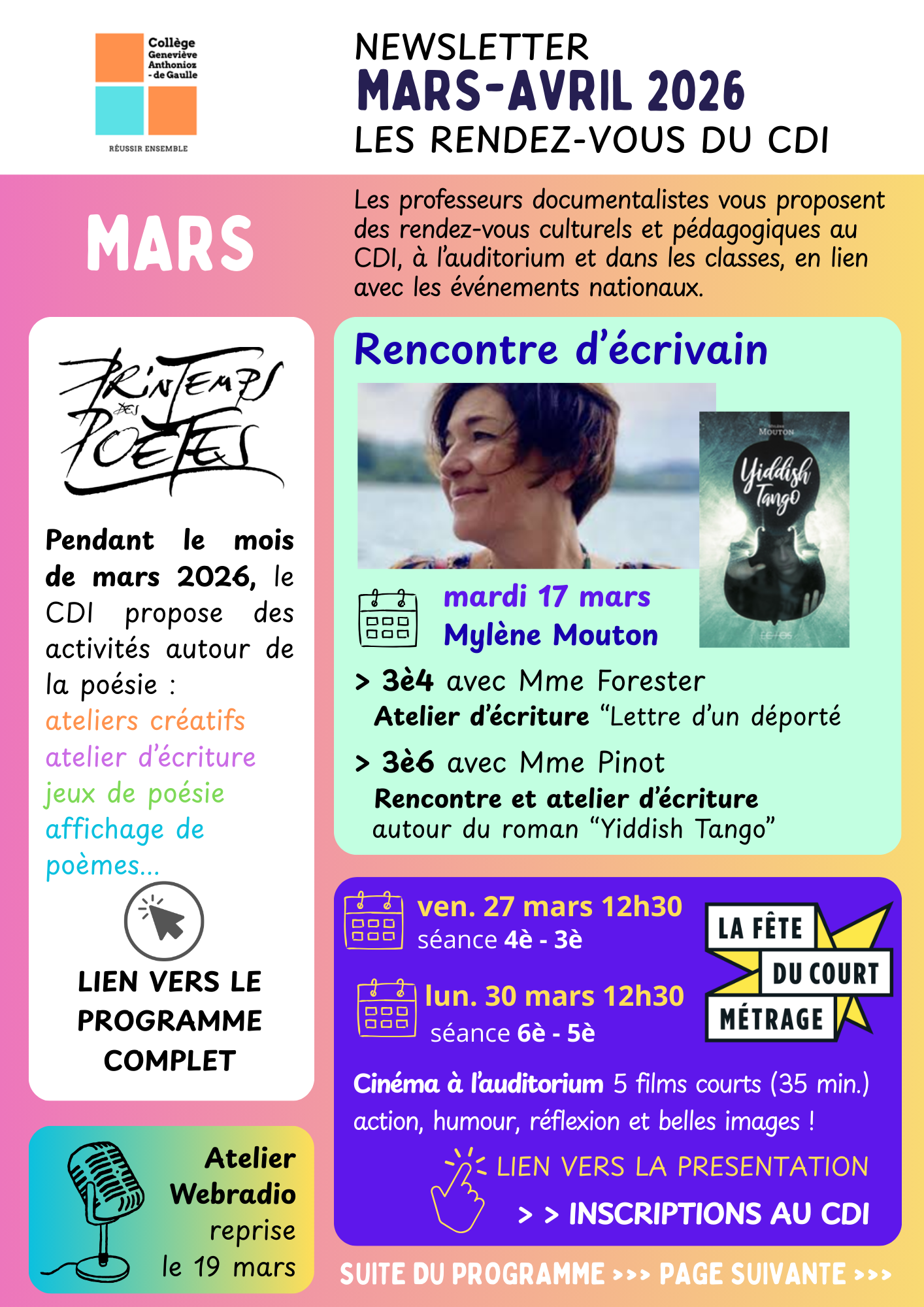 Les professeurs documentalistes vous proposent des rendez-vous culturels et pédagogiques au CDI, à l’auditorium et dans les classes, en lien avec les événements nationaux : Printemps des poètes, semaine de la presse, rencontre avec des écrivains, Fête du court métrage, nouveautés...